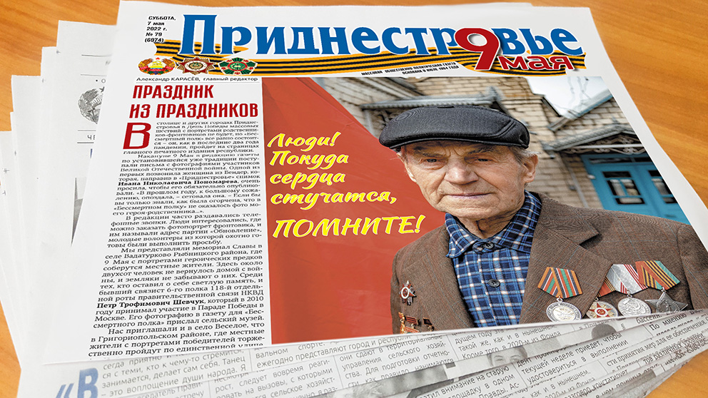 Открывается праздничный номер газеты передовицей главного редактора. Он пишет, что в столице и других городах Приднестровья в День Победы массовых шествий с портретами родственников-фронтовиков не будет, но «Бессмертный полк» все равно состоится – он, как и прежде в последние два года пандемии, пройдет на страницах газеты. Люди в который раз обратились к старым фотоальбомам и архивным документам, воспоминаниям о героических родственниках...