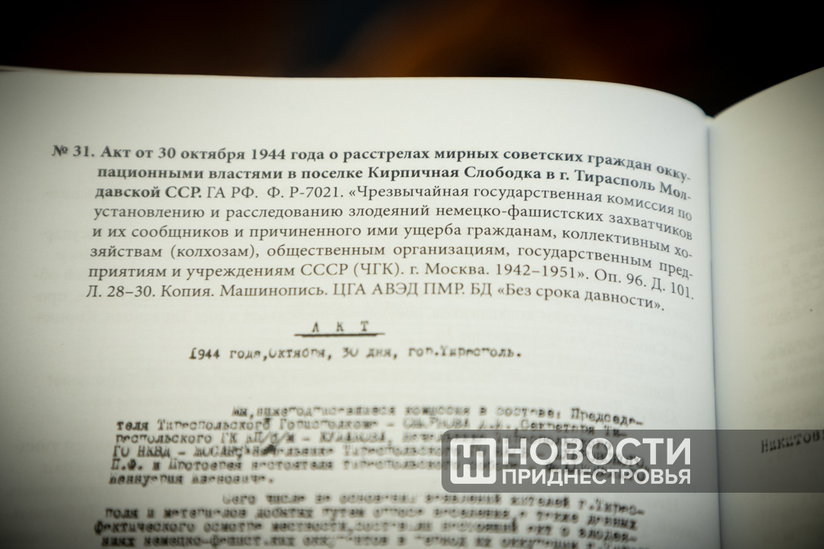 Протоколы допросов нацистов, отдававших приказы и лично убивавших тысячи людей, списки угнанных и расстрелянных в каждом городе и районе, результаты медицинского освидетельствования найденных останков, фамилии румын, которые вывозили из Тирасполя имущество людей и оборудование с заводов, опросные листы тех, кого угнали на принудительные работы, фотографии изуродованных трупов…