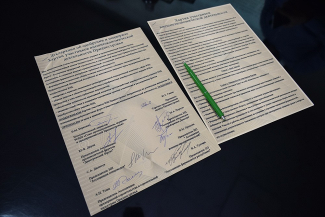 Декларацию об одобрении и поддержке Хартии участников внешнеэкономической деятельности Приднестровья подписали руководители СПАПП, ТПП и шести ведущих бизнес-ассоциаций и союзов республики, а также руководители более десяти предприятий, первыми получивших статус национальных.