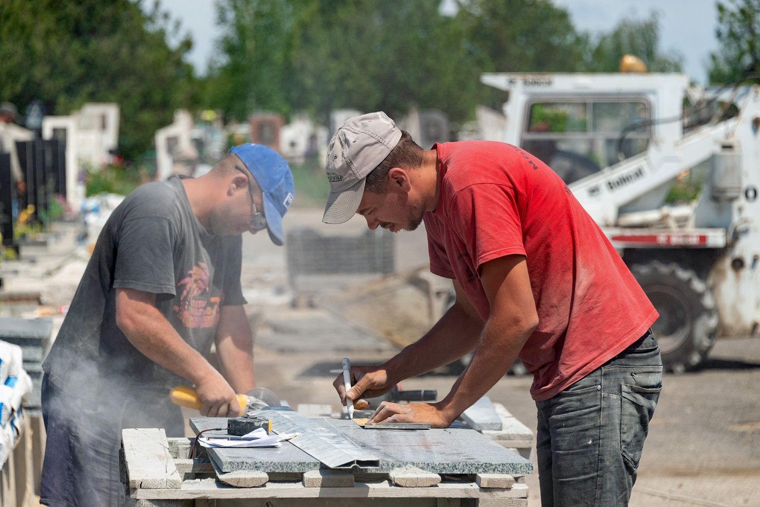 Рабочие покрывают тротуарной плиткой дорожки. Также облагораживается территория вокруг памятного креста, возле которого проходят литии по погибшим защитникам республики.