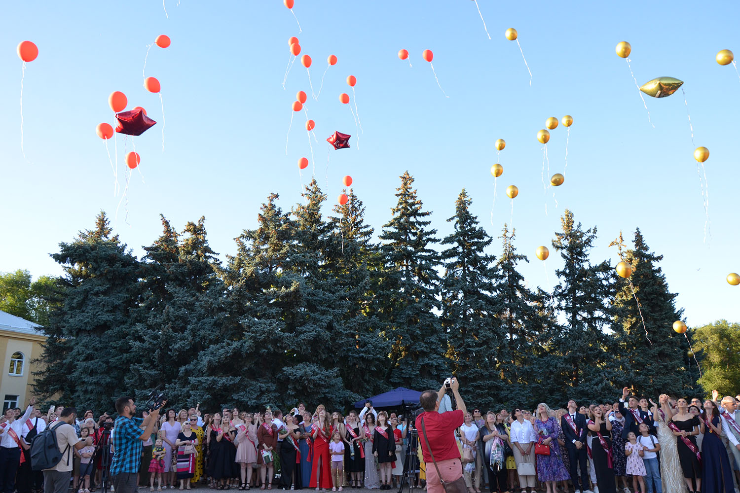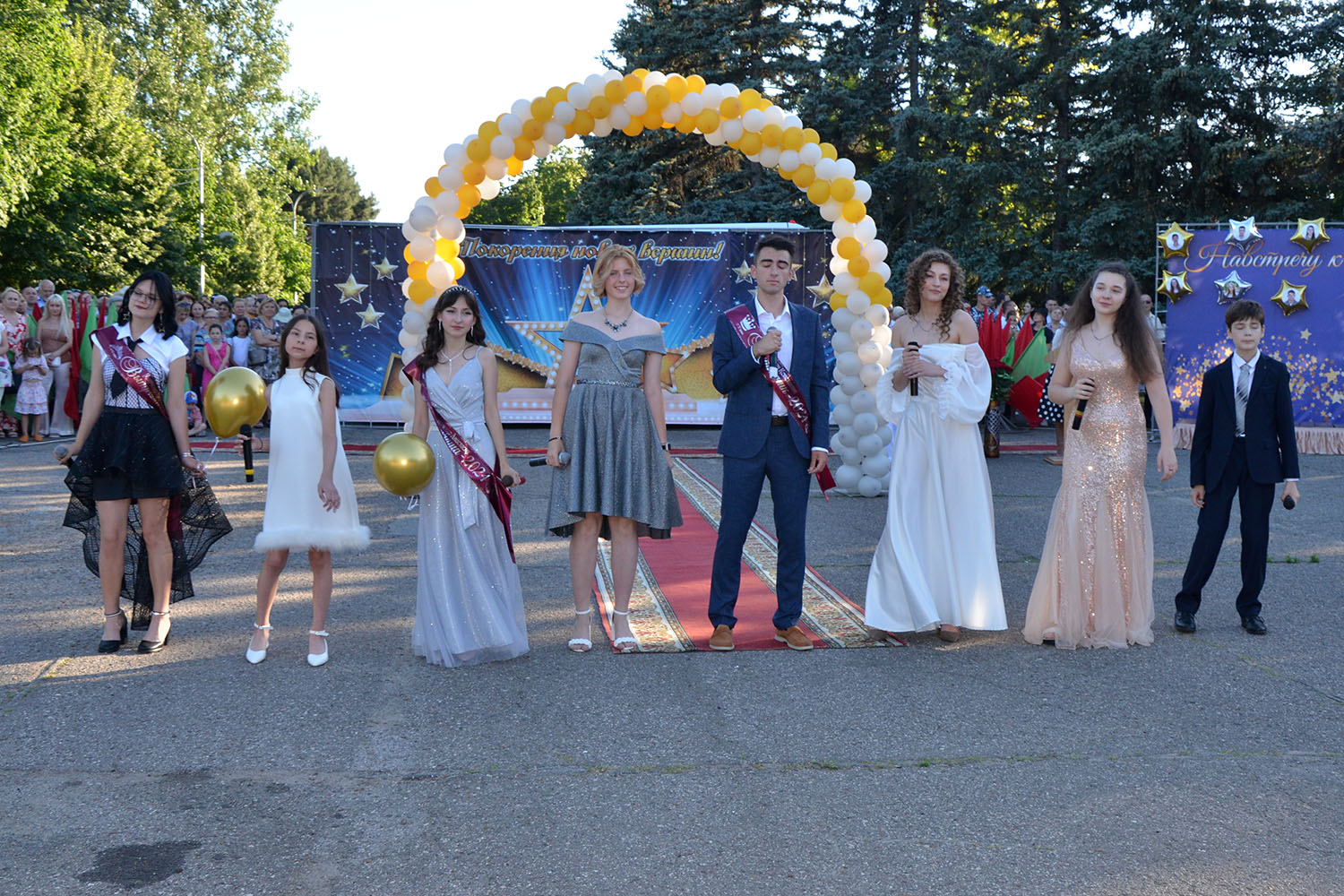 Поздравили выпускников с важным событием в их жизни своими выступлениями и образцовые коллективы Дворца детско-юношеского творчества – Театр песни «Овация» и ансамбль эстрадного танца «Серпантин». Герои торжества выпустили в небо воздушные шары — как символ уходящего детства.
