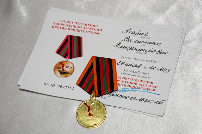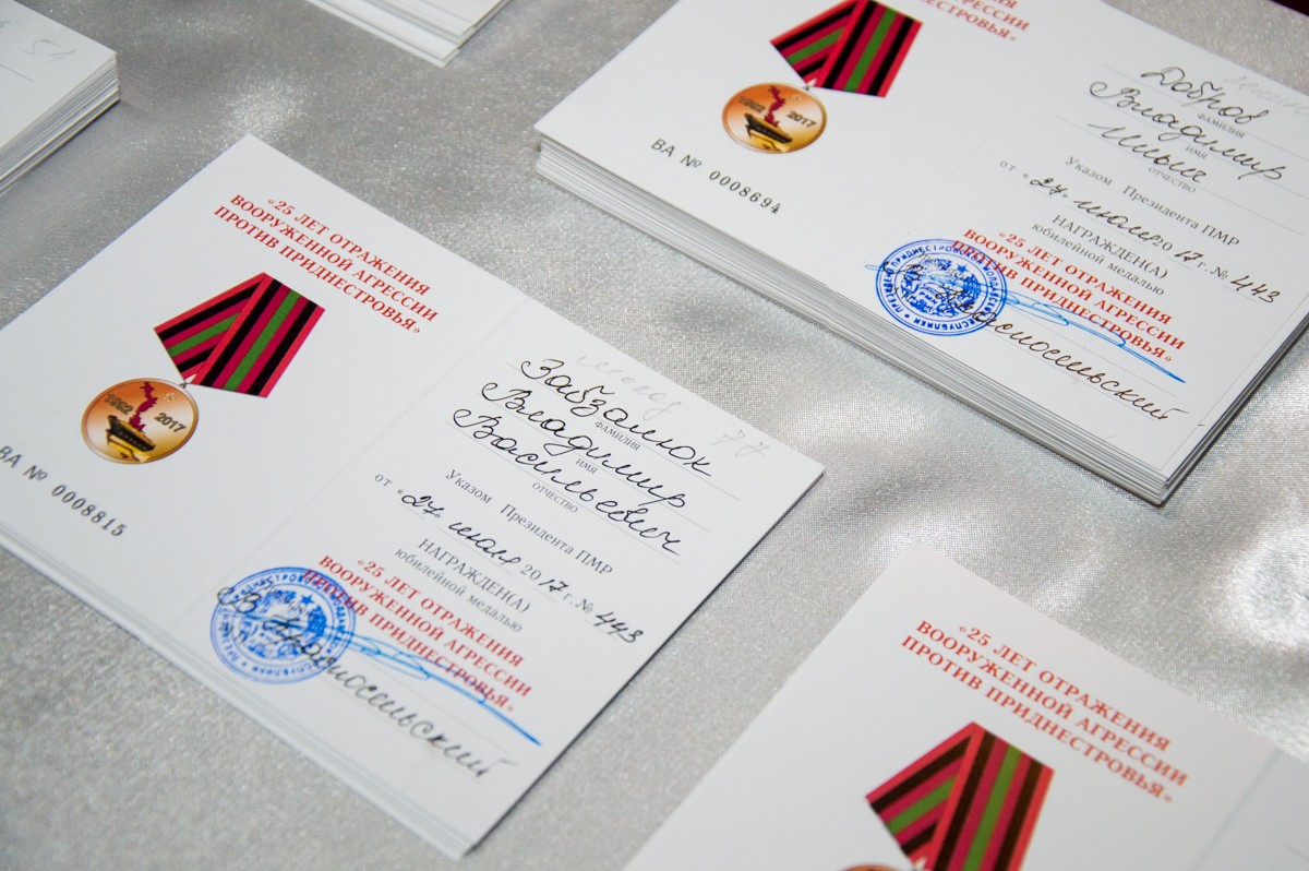 Официально глава ведомства вручил почетные награды Игорю Дудкевичу и Михаилу Каткову. После чего все присутствующие защитники были награждены медалью «25 лет отражения вооруженной агрессии против Приднестровья».