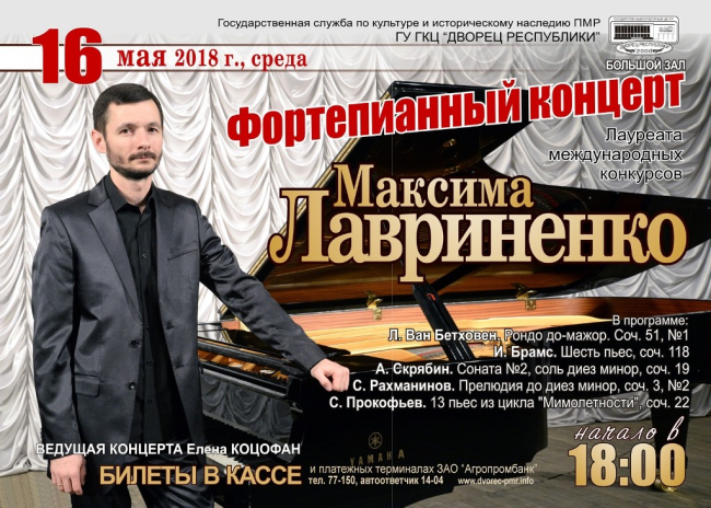 Тирасполь, 15 мая. /Новости Приднестровья/. Завтра, 16 мая, в большом зале Дворца Республики пройдет первый сольный концерт лауреата международных конкурсов, выдающегося пианиста Максима Лавриненко.