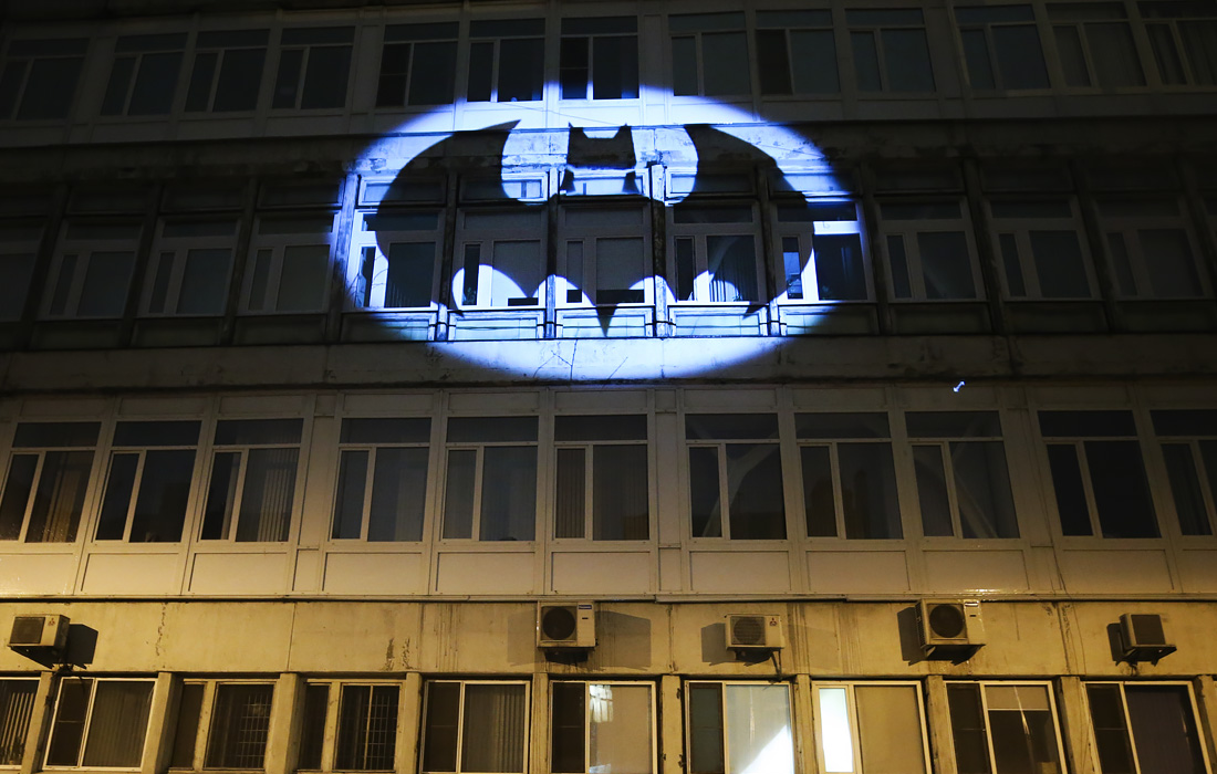 Супергероев на помощь призывают и в России. В Санкт-Петербурге на стене здания появилась световая проекция бэт-сигнала с Бэтменом в медицинской маске. Её создатели – художественная группа «Явь» – так напоминают о важности режима самоизоляции. Фото: Петр Ковалев/ТАСС