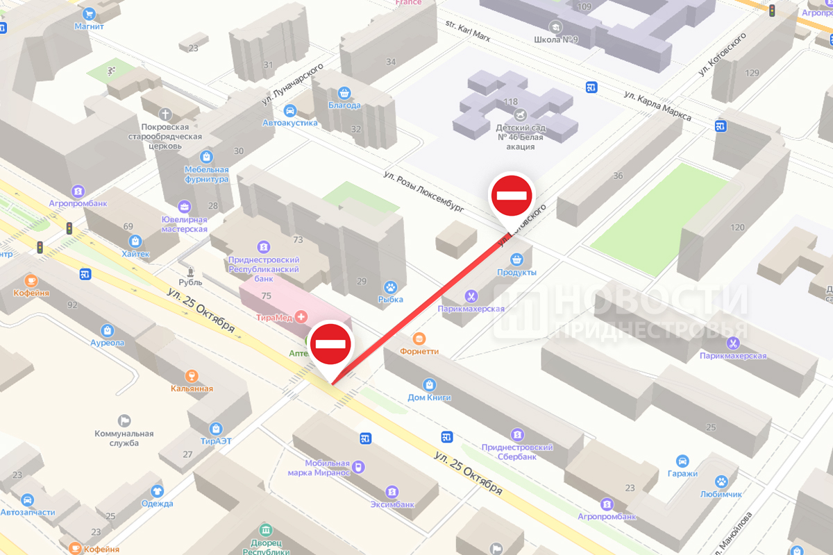 Тирасполь, 23 мая. /Новости Приднестровья/. С 18 по 30 мая в Тирасполе полностью перекрыто движение автотранспорта по улице Котовского - на участке от ул. Розы Люксембург до ул. 25 Октября.