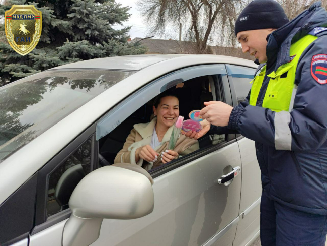 Тирасполь, 8 марта. /Новости Приднестровья/. Сегодня утром во всех городах и районах республики инспекторы ГАИ дарили женщинам-водителям цветы и яркие открытки.
