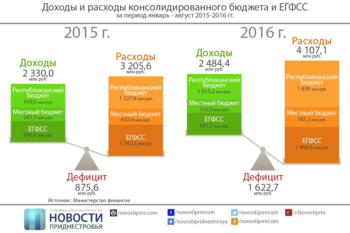 Тирасполь, 9 сентября. /ИА «Новости Приднестровья»/. Дефицит консолидированного бюджета Приднестровья за 8 месяцев 2016 года вдвое больше, чем за аналогичный период 2015-го. Об этом свидетельствуют данные опубликованные на сайте Министерства финансов ПМР. Так если по итогам 8 месяцев 2015-го он составлял 875,6 млн руб., то по итогам аналогичного периода 2016 года дефицит консолидированного бюджета составляет 1 622 млн рублей.