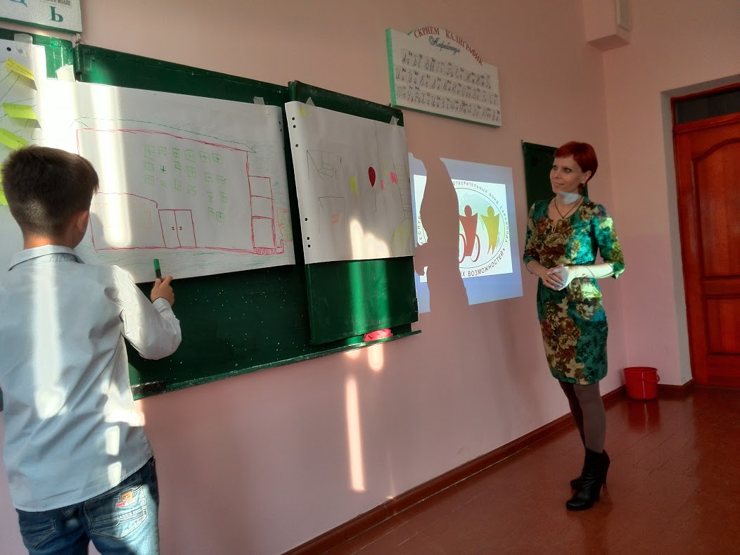 В завершение урока детям предлагается спроектировать школу, удобную для всех. Предварительно школьникам рассказывают о средствах доступности, изобретённых человечеством. Свои проекты они презентуют в нарисованном виде.