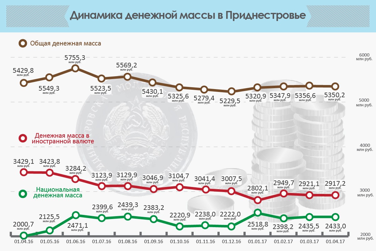 Тирасполь, 10 апреля. /Новости Приднестровья/. Согласно данным денежной статистики, совокупный объём денежного предложения за март 2017 года уменьшился на 0,1% и на 1 апреля составил 5 350,2 млн руб.