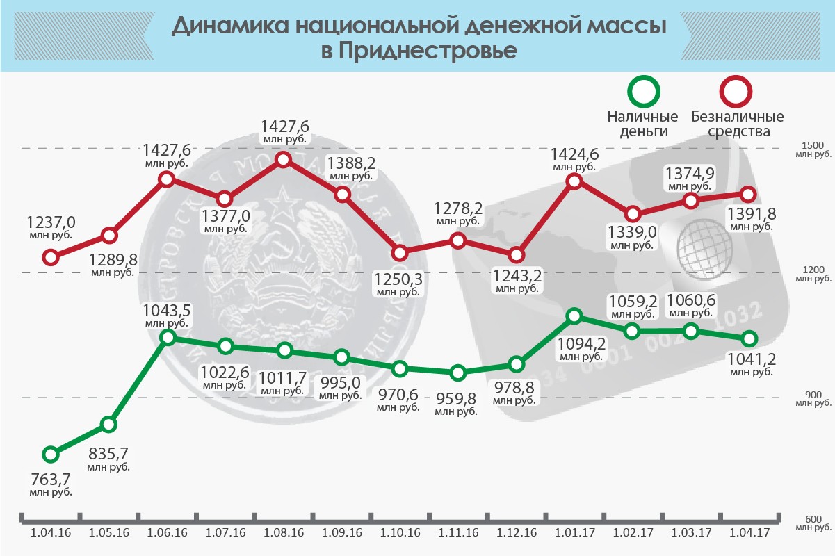 Как сообщается на официальном сайте Центробанка ПМР, национальная денежная масса за отчётный месяц сократилась на 0,1% до 2 433,0 млн руб. за счёт снижения объёма наличных денег в обращении на 1,8% до 1 041,2 млн руб. При этом безналичная составляющая увеличилась на 1,2% до 1 391,8 млн руб. Коэффициент наличности сложился на отметке 42,8% (-0,7 п.п.).