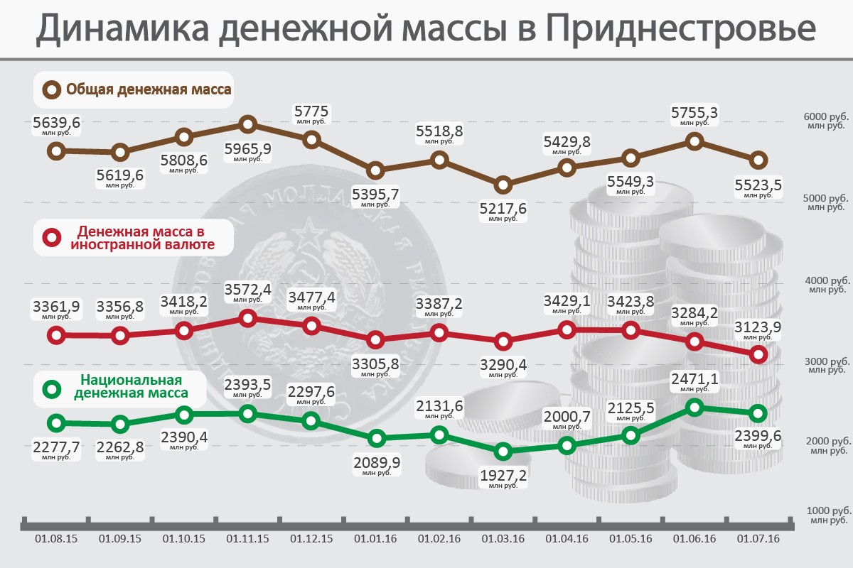 За первый месяц лета количество наличных рублей сократилось на 2% (с 1 млрд 44 млн руб. до 1 млрд 23 млн руб.), количество безналичных денежных средств в рублях ПМР — на 3,5% (с 1 млрд 428 млн до 1 млрд 377 млн руб.), денежной массы в иностранной валюте — на 4,9% (с 3 млрд 284 млн до 3 млрд 124 млн в рублёвом эквиваленте).
