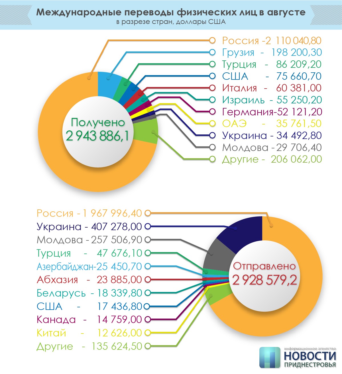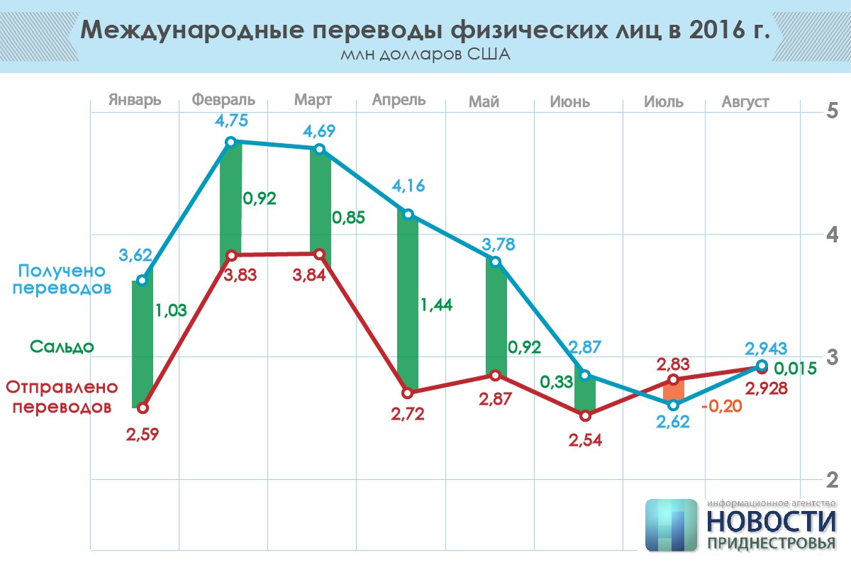 Всего же с начала года республика получила 29,4 миллиона долларов США денежными переводами. Это один из исторических минимумов с 2008 года. При этом 24 миллиона долларов были отправлены из Приднестровья в другие страны.
