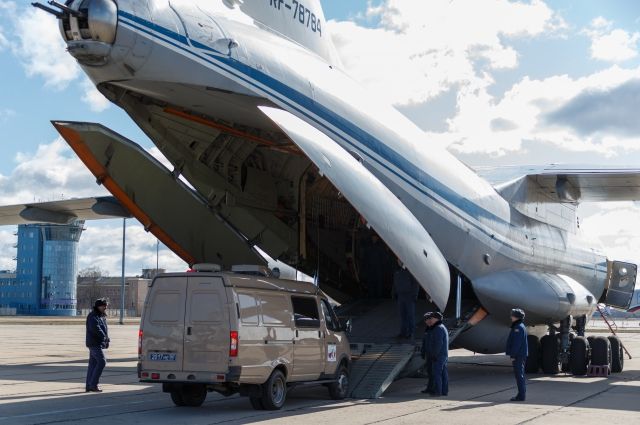 По поручению президента России Минобороны РФ создало авиагруппировку из девяти самолетов Ил-76. По данным ведомства, в группировку медиков вошли восемь мобильных бригад медиков и около 100 военных специалистов-вирусологов и эпидемиологов. Также самолетами были доставлены автомобильные комплексы аэрозольной дезинфекции транспорта и территории и медицинское оборудование.
