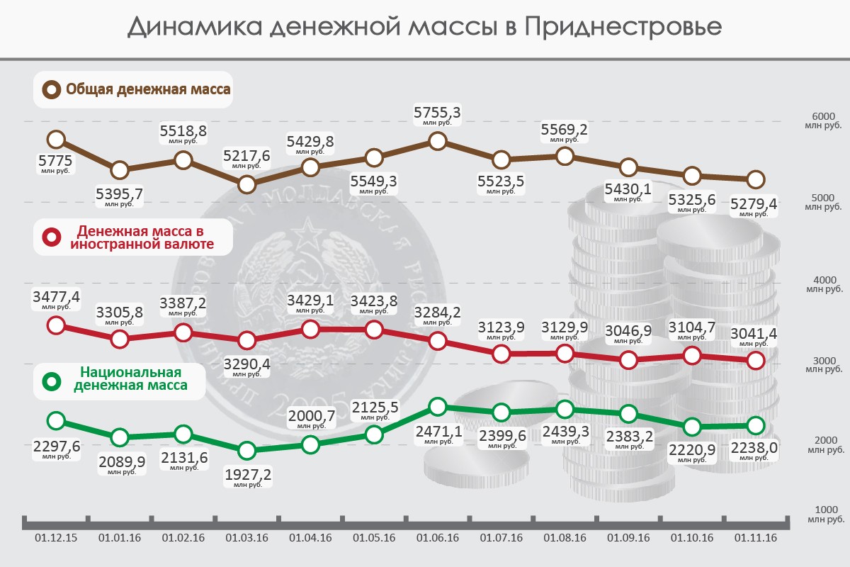 Меж тем, в её структуре по-прежнему сохраняется преобладание средств в иностранной валюте над находящимися в обороте (как наличными, так и безналичными) приднестровскими рублями. На 1 ноября на иностранную валюту приходится 57,6% от общего объёма денежной базы, а на рубли – 42,4%.