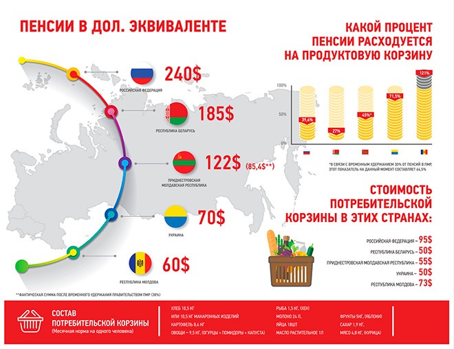 «Например, размер пенсии в среднем по Приднестровью составляет 122 доллара, что практически вдвое превышает пенсию как на Украине, так и в Молдове. Несмотря на то что из этой суммы временно и вынужденно удерживается около 30%, уровень жизни пенсионеров остается одним из самых высоких в регионе. В свою очередь, именно эта непопулярная мера, по мнению экспертов, помогла удержать курс рубля и не допустить инфляции», - отмечает «Дни.Ру».