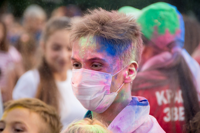 После танцевального флешмоба всем гостям начали раздавать краски Холи. Желающих оказалось очень много, поэтому началась настоящая «битва» за пакетик с цветным порошком. Несмотря на такой ажиотаж красок хватило всем, так что за считанные минуты гости праздника стали разноцветными.