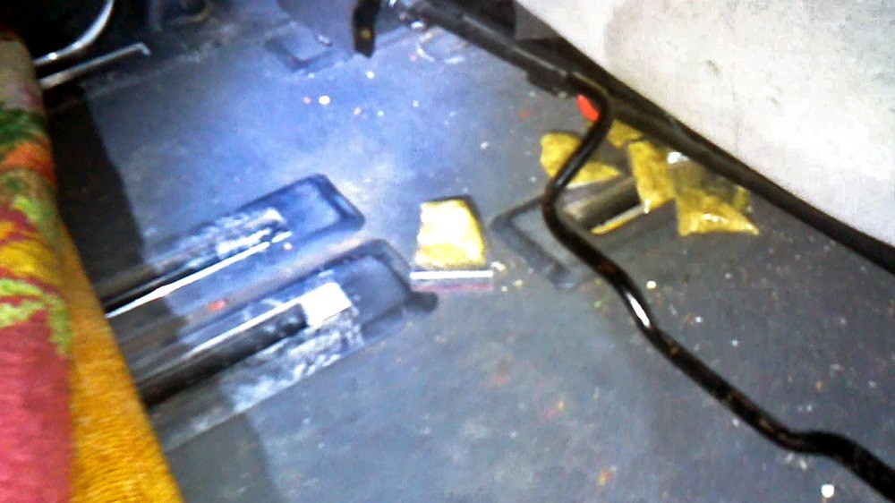 В результате под задним пассажирским сидением было обнаружено пять полиэтиленовых пакетов, содержащих измельченную растительную массу с частицами желтого цвета.