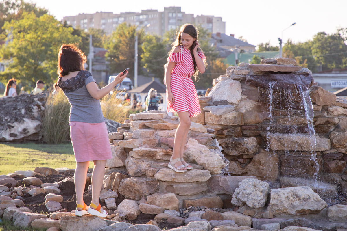 Центр парка – самый воздушный. Фонтанные каскады, уличные фонари под старину, удобные лавочки и красивые локации. В день открытия и посетители здесь гуляли под стать атмосфере.
