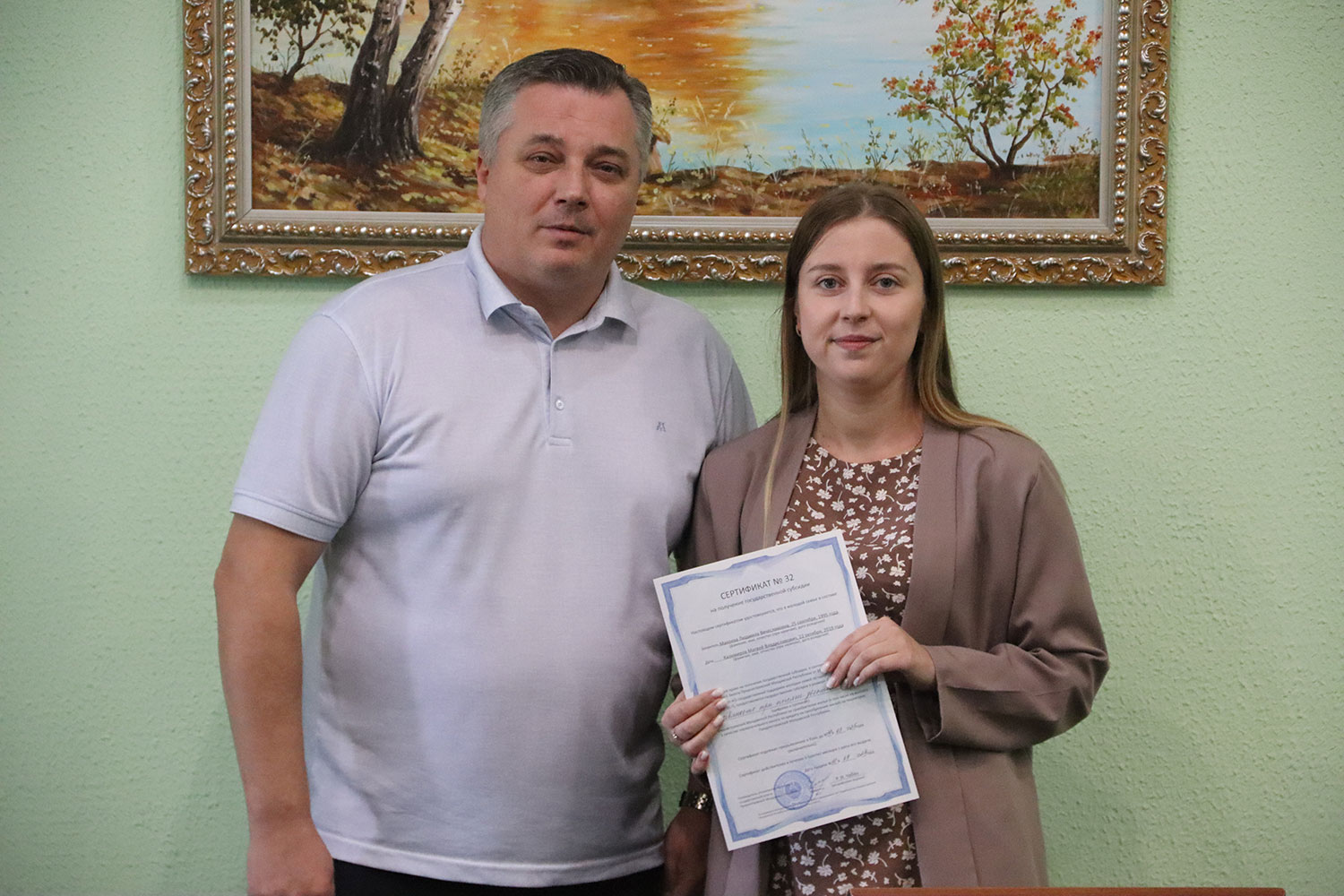 «В Дубоссарах уже 4-й год успешно реализуется государственная программа субсидирования на приобретение жилья для молодых специалистов. Сегодня у нас радостное событие — мы вручаем 32-й сертификат. Он на сумму 193 тысячи 200 рублей ПМР. Обладателем сертификата стала молодой педагог», - отметил глава госадминистрации Руслан Чабан и поздравил обладательницу документа.