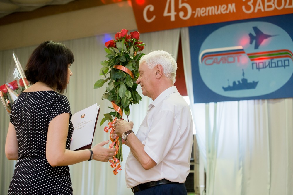 Сегодня же согласно Указу Президента за высокие достижения по выпуску высококачественной продукции производственно-технического назначения, большой вклад коллектива в социально-экономическое развитие ПМР и в связи с 45-летием со дня образования филиала «Завод «Прибор» акционерного общества «Научно-производственный центр газотурбостроения «Салют» предприятие было награждено орденом «Трудовая Слава». В торжественной обстановке вручили государственную награду и.о. Руководителя Администрации Президента Ирина Жураковская и Председатель Правительства Павел Прокудин.