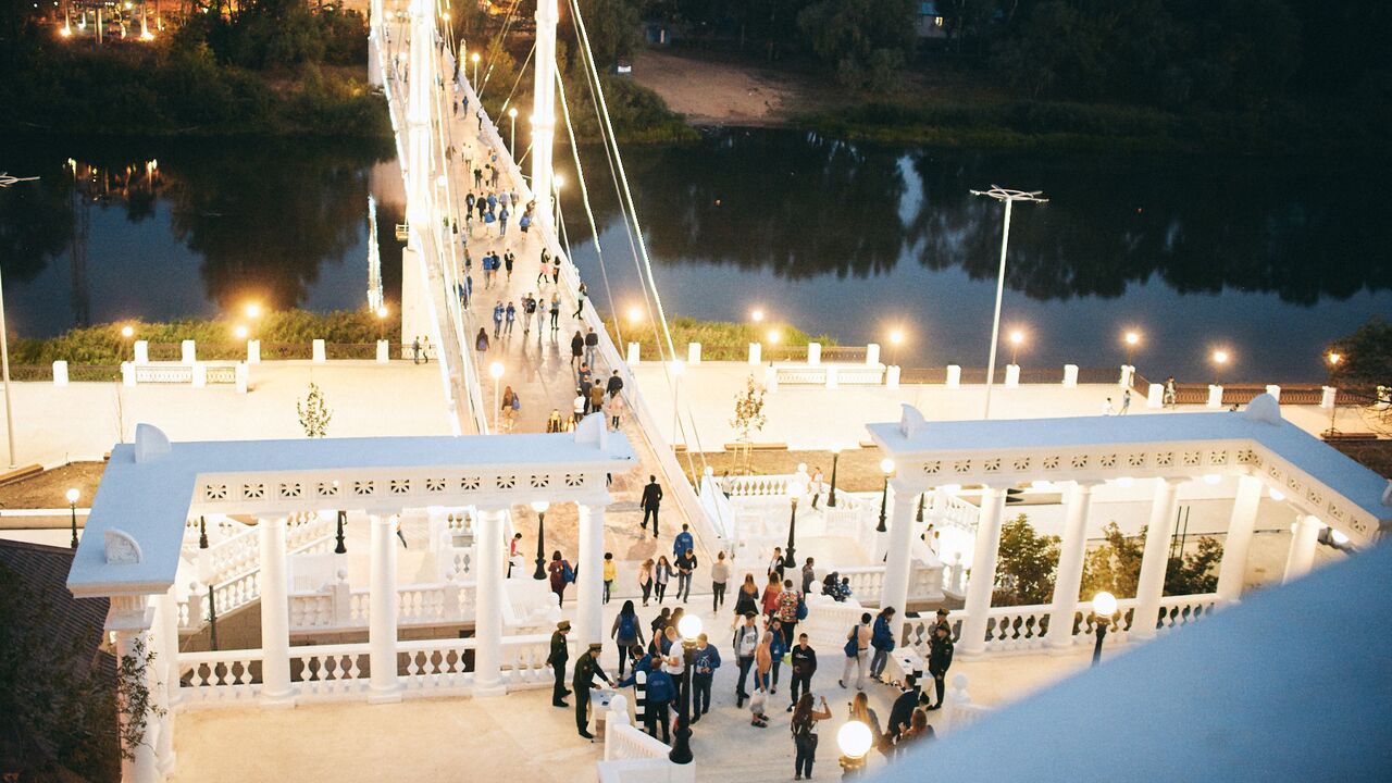 В конце пешеходной зоны открывался прекрасный вид на местную набережную и реку Урал. Она символически делит город на Европу и Азию, о чем и свидетельствует стела на середине подвесного моста. Так что, проходя половину моста в Европе, вы внезапно оказываетесь в Азии. В подтверждение тому здесь даже выдают документ!