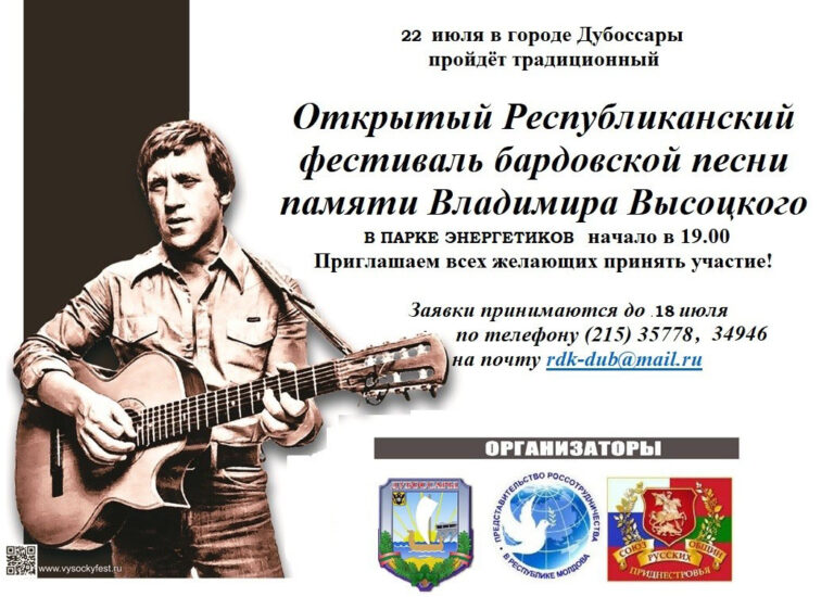 Дубоссары, 13 июля. /Новости Приднестровья/. 22 июля в Дубоссарах пройдёт открытый республиканский фестиваль бардовской песни памяти Владимира Высоцкого «Я, конечно, вернусь». Мероприятие состоится в парке Энергетиков и начнётся в 19:00, сообщили в дубоссарской госадминистрации.