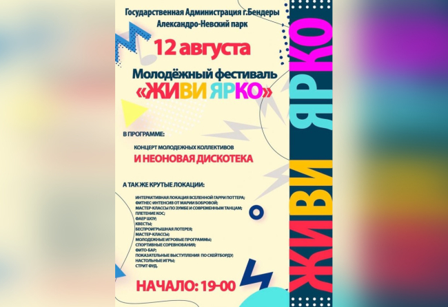Бендеры, 9 августа. /Новости Приднестровья/. 12 августа в Александро-Невском парке пройдет Молодежный фестиваль «Живи ярко».