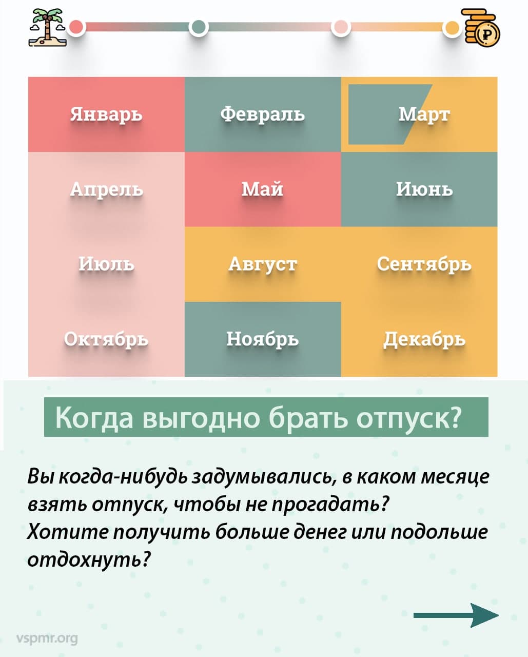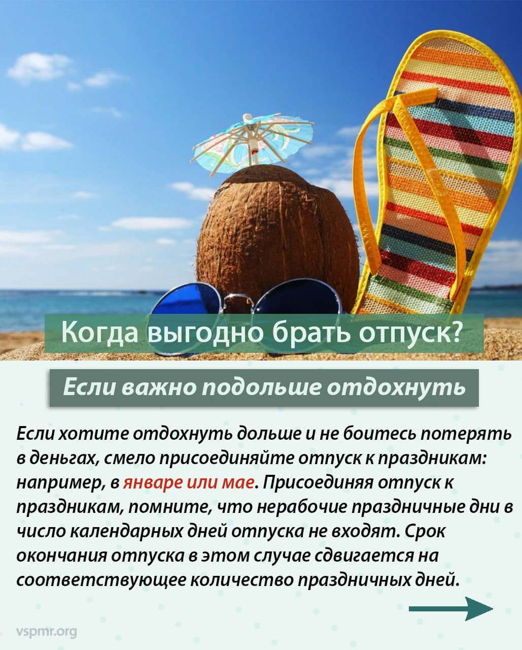 Также авторы канала дают советы, когда лучше взять отпуск – в зависимости от цели, которую преследует работник. Если он хочет получить больше выплат, то лучше для этих целей выбрать месяц, где больше всего рабочих дней и нет праздников. Если же цель – побольше отдохнуть, то лучше взять отпуск в месяцы, где больше всего выходных и праздников.