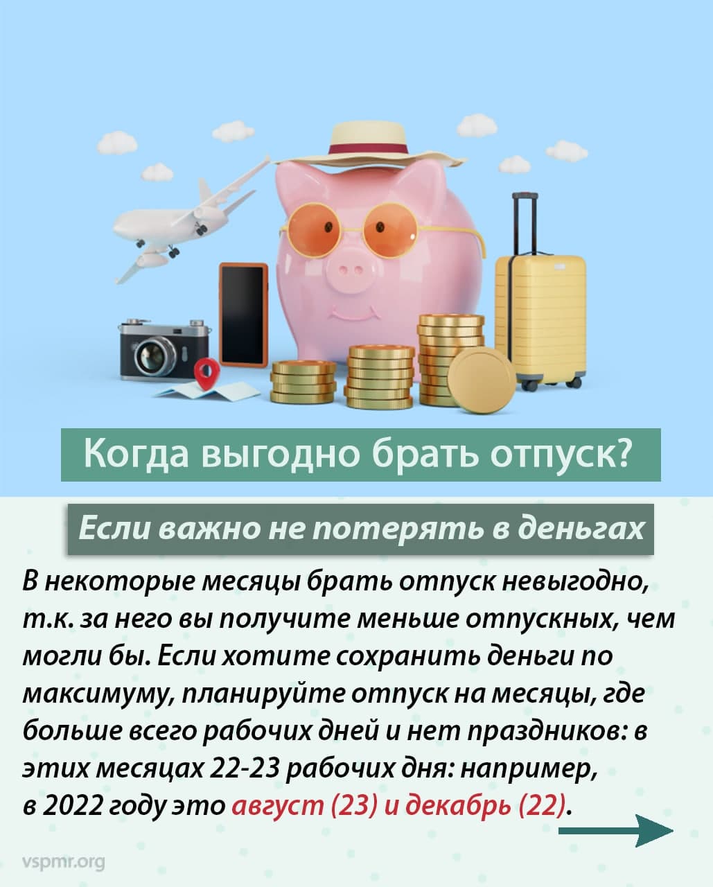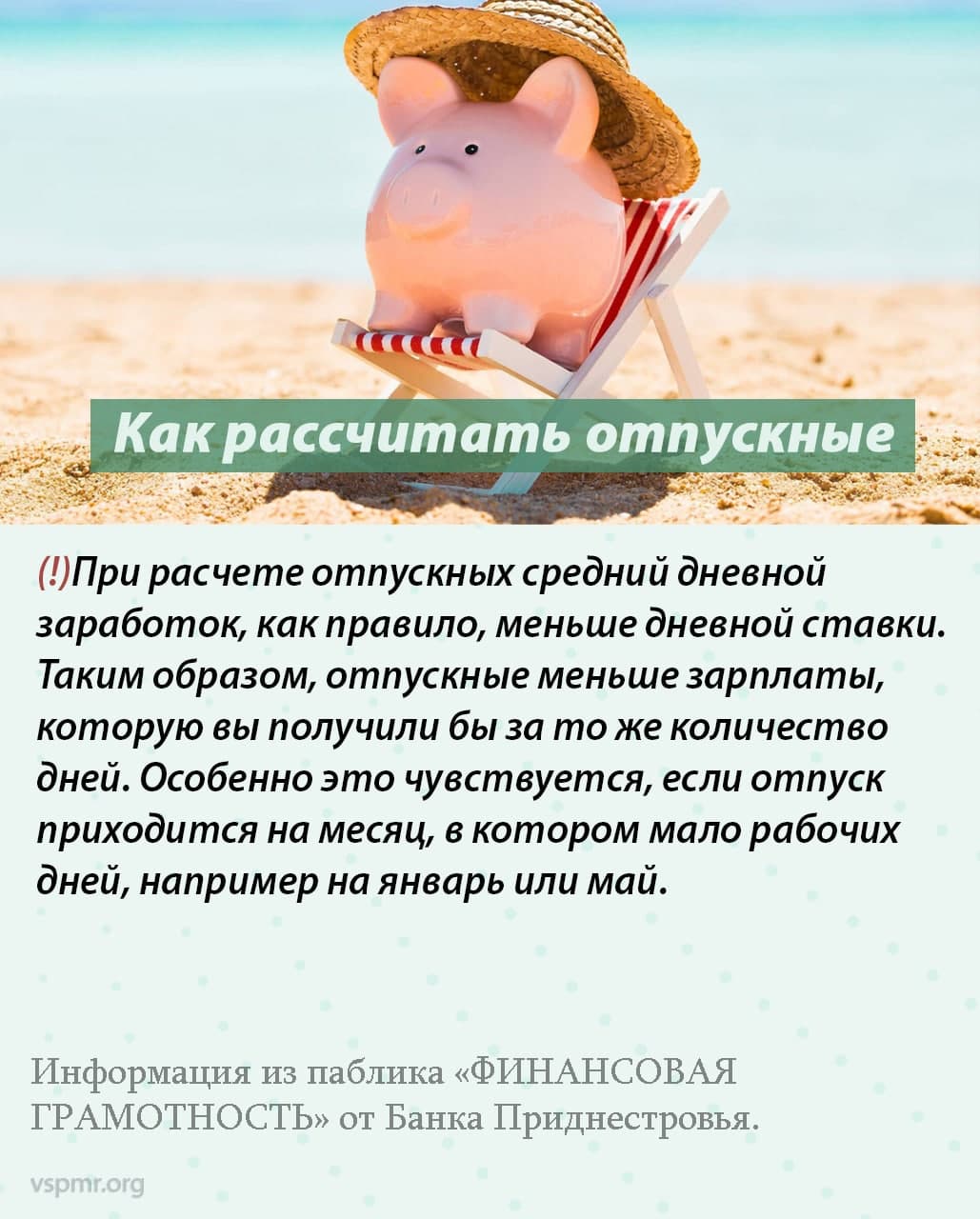 Тирасполь, 14 июля. /Новости Приднестровья/. Пора отпусков в самом разгаре. Канал «Финансовая грамотность» Приднестровского республиканского банка (в Вайбере и в Фейсбуке) подготовил рекомендации, связанные с выплатами за отпуск.