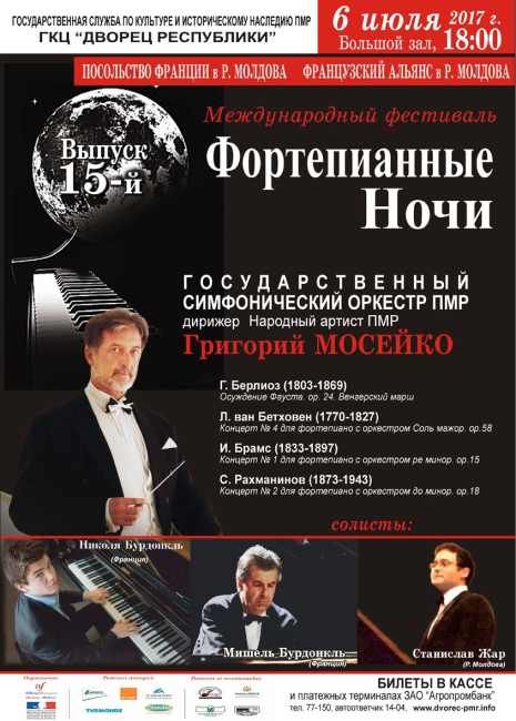 Тирасполь, 27 июня. /Новости Приднестровья/. 6 июля в Тирасполе пройдет международный музыкальный фестиваль «Фортепианные ночи». Ожидаются зарубежные солисты Николя и Мишель Бурдонкль (Франция), а также молдавский исполнитель Станислав Жар.