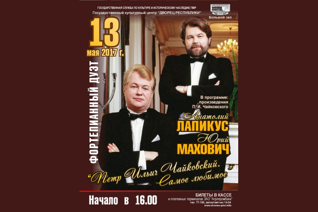 Тирасполь, 11 мая. /Новости Приднестровья/. 13 мая молдавские музыканты Анатолий Лапикус и Юрий Махович выступят во Дворце Республики. Они исполнят лучшие произведения русского композитора, педагога, дирижёра и музыкального критика Петра Ильича Чайковского.