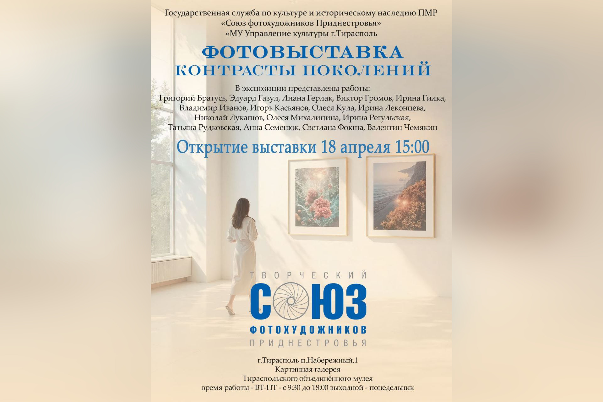 Тирасполь, 17 апреля. /Новости Приднестровья/. В Тираспольской картинной галерее 18 апреля состоится торжественное открытие выставки Союза фотохудожников Приднестровья «Контрасты поколений». Начало вернисажа – в 15:00.