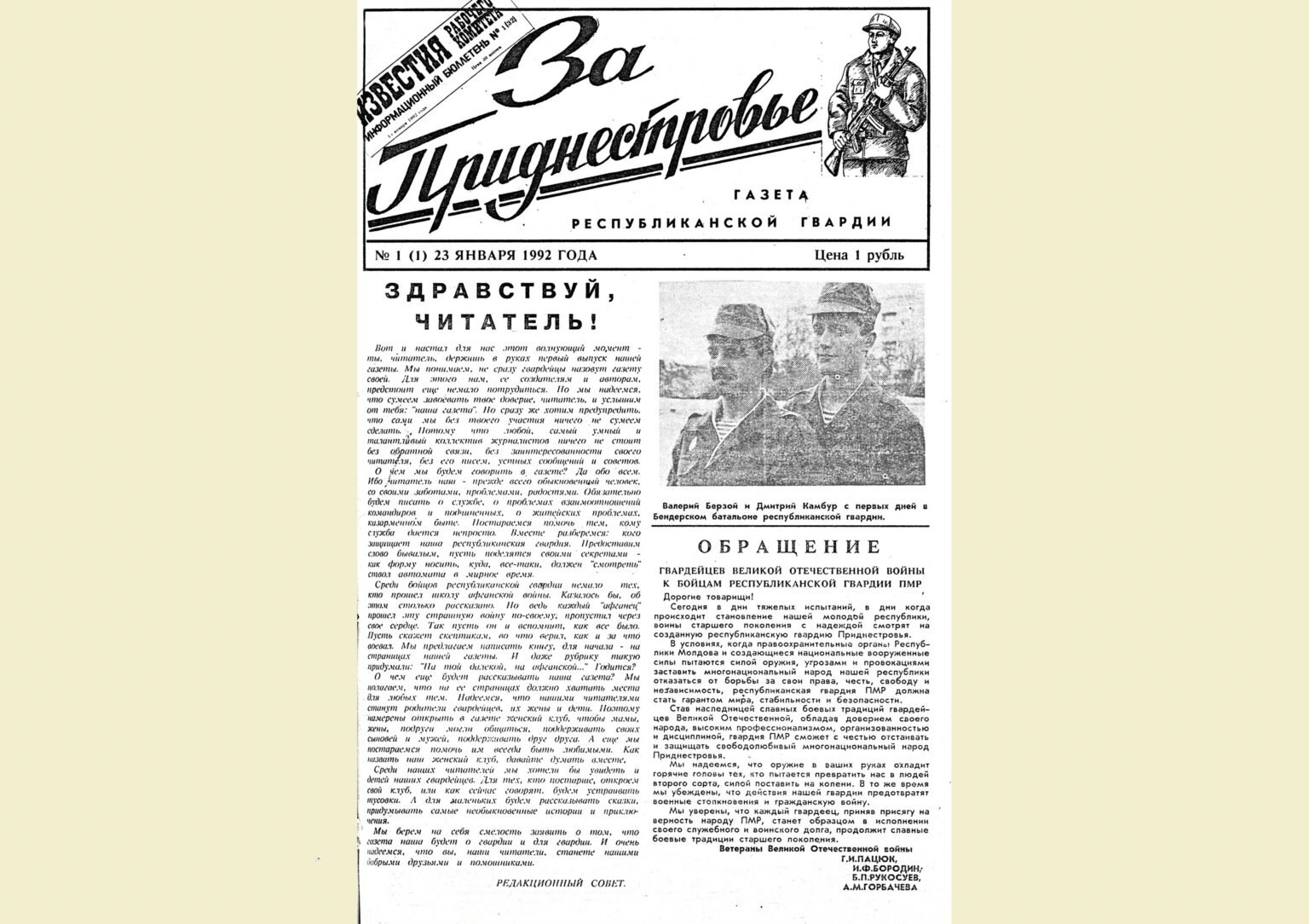 «В первом выпуске газеты было письмо родителей гвардейцев, которые благословляли своих сыновей, был рассказ о гвардейце, который воевал в Афганистане, и другие материалы. Трудностей в сборе материалов в тот период не было. Рабочий комитет взял на себя расходы по выпуску газеты, по предоставлению бумаги. Первые выпуски газеты были с плашечкой "Известия Рабочего комитета". Над названием газеты долго не думали, решили назвать по образцу газет времен Великой Отечественной войны – "За Приднестровье". Наш художник, который рисовал первый заголовок названия, забыл поставить восклицательный знак, так название и осталось. Специально выбрали альбомный формат газеты, чтобы ее было удобно читать», – вспоминает первый редактор газеты "За Приднестровье" Наталья Воробьева.