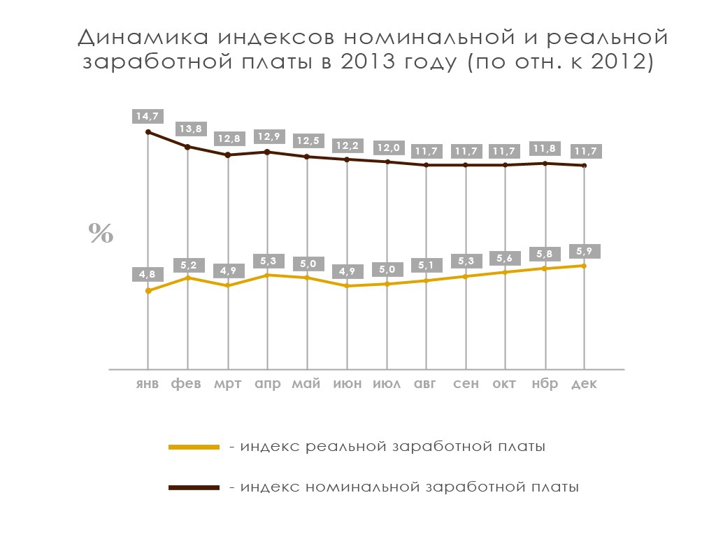 Согласно статданным, в прошлом году размер реальной заработной платы увеличился на 5,9%, при этом рост начисленной заработной платы к концу 2013-го составил 11,7% (Диаграмма 2).
