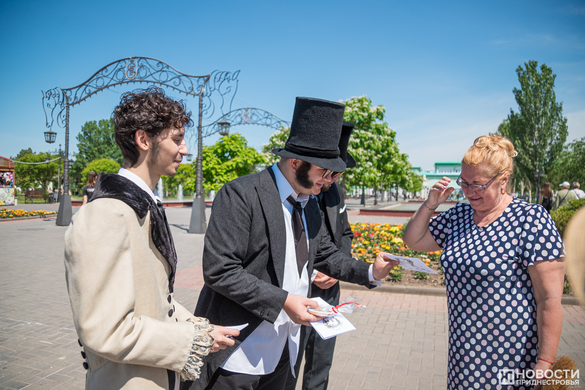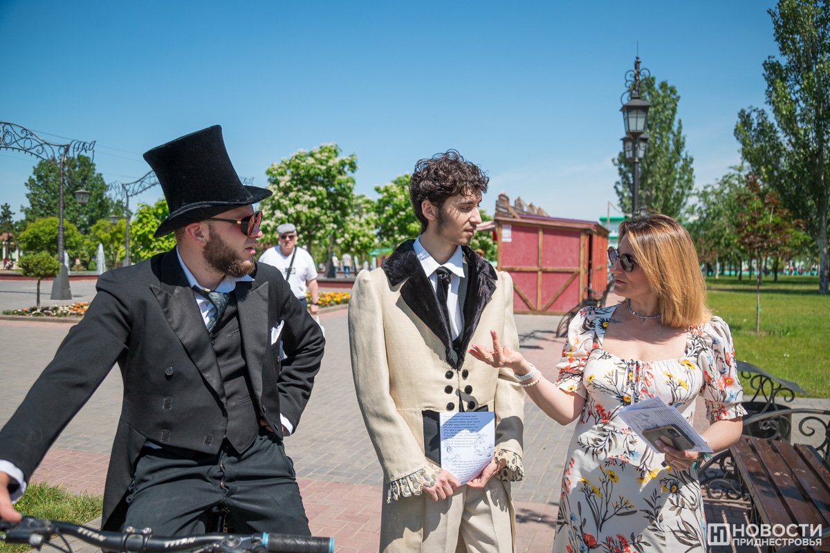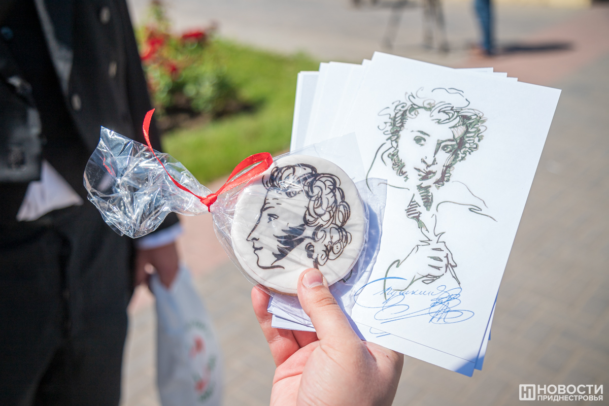Параллельно с этим о Пушкине и Дне русского языка тираспольчанам рассказывали переодетые в великого поэта волонтёры. Прямо на улицах города они задавали вопросы о его творчестве, а тем, кто мог навскидку продекламировать что-то из его стихотворений, дарили пряники с изображением Пушкина.