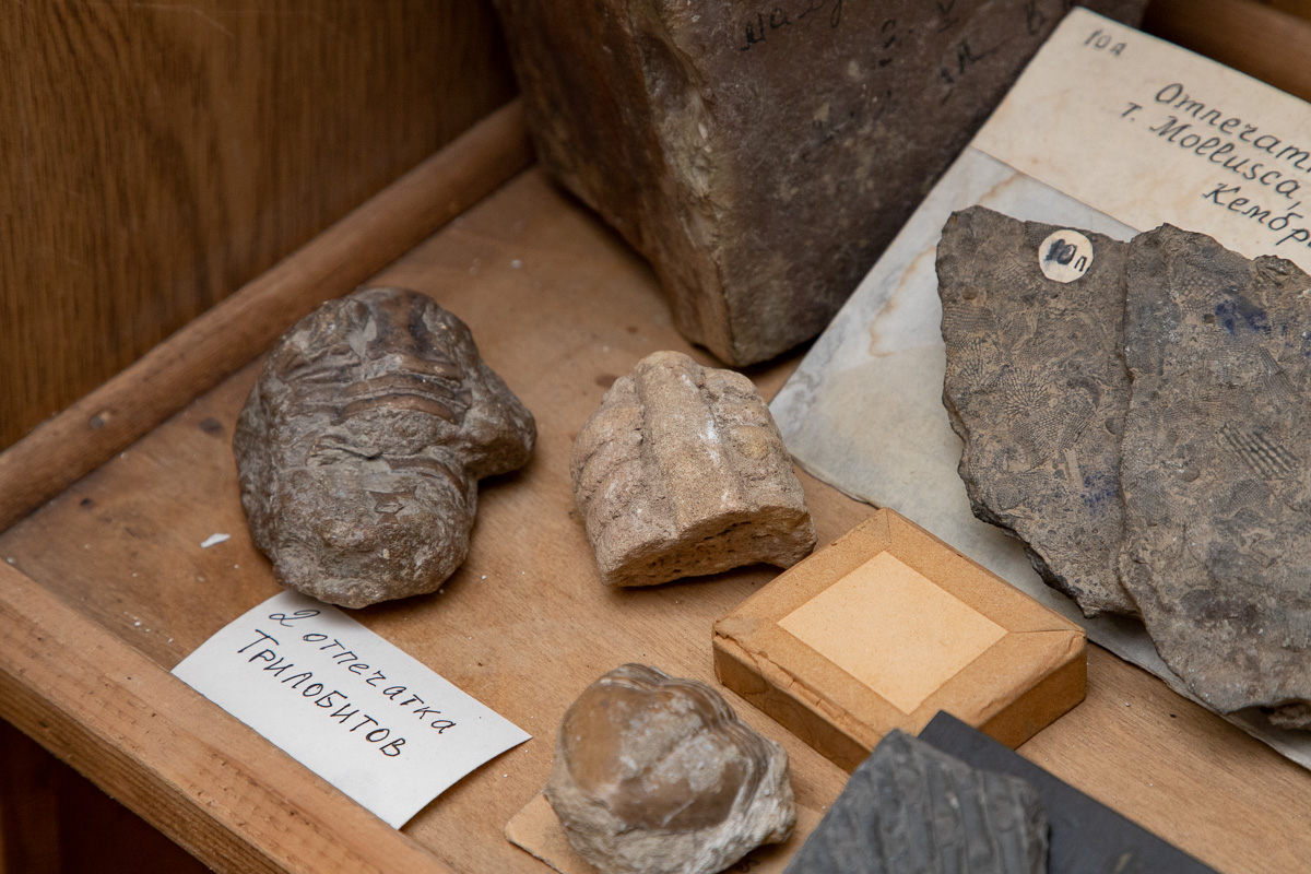 Здесь хранится окаменевший панцирь трилобита – одного из самых древних членистоногих, которые вымерли в конце палеозойской эры (около 300 миллионов лет назад). Их тела покрывал хитиновый панцирь, длина всего тела могла достигать от нескольких миллиметров до 70-80 см. Определить точный возраст древних членистоногих сложно. Дело в том, что у каждого периода палеозоя были свои виды трилобитов. И судя по толщам пород, которые находятся на нашей территории, этот окаменевший панцирь может принадлежать трилобиту, который жил 500-400 млн лет назад.