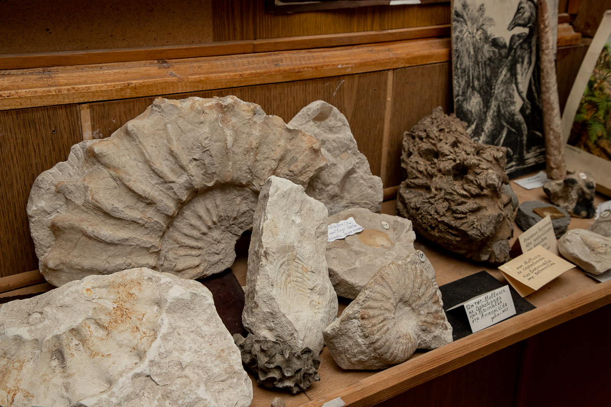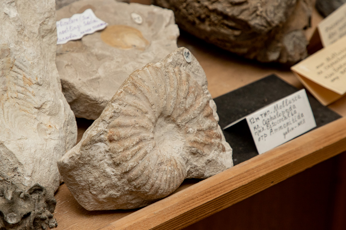 Представителями мезозойской эры (250–66 миллионов лет назад), чьи отпечатки раковин находятся в геолого-палеонтологическом музеи, являются аммониты. Это представители наружнораковинных головоногих моллюсков существовали в морях на протяжении сотен миллионов лет, но около 65 миллионов лет назад почти все они вымерли. Обнаружить огромные раковины аммонитов можно в меловых породах, которым около 145-66 миллионов лет. Их размеры могут достигать двух метров, как колесо большого автомобиля.