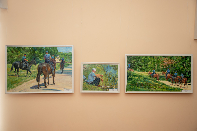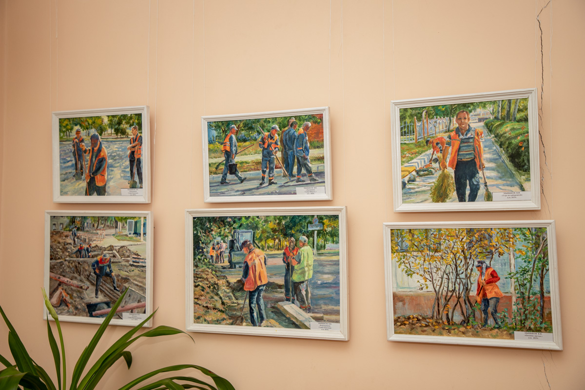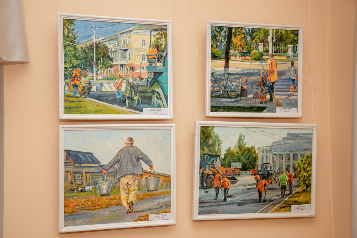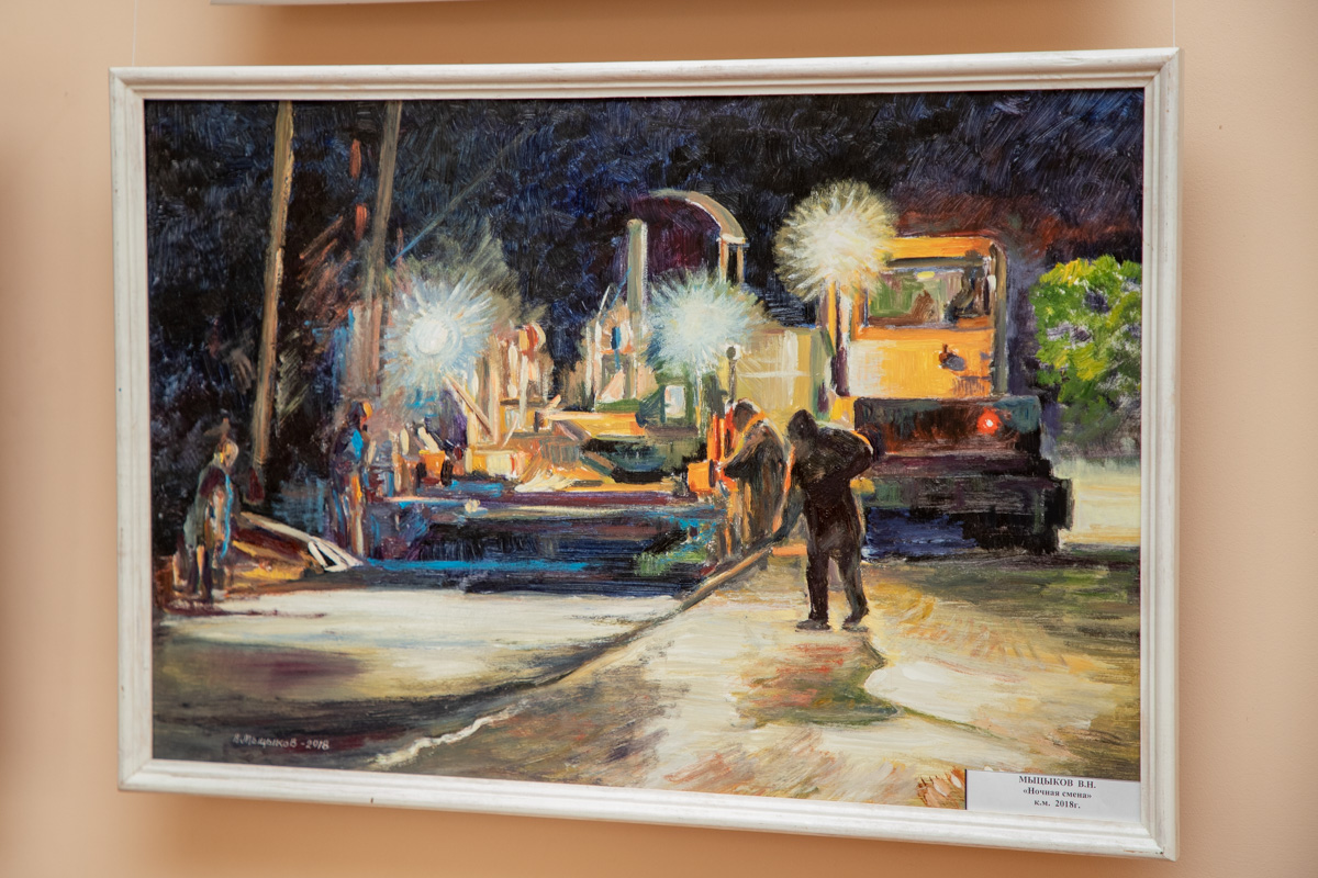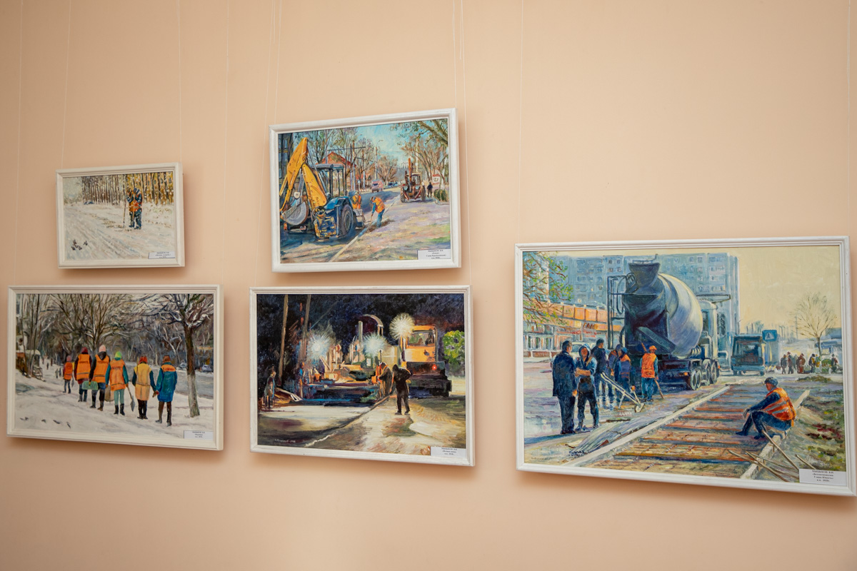 На выставке представлено 37 работ, выполненных маслом. Полотна были созданы в период с 2017-го по 2020 год. В основном на картинах изображена трудовая деятельность людей рабочих профессий: сотрудников дорожной отрасли, электромонтажников, милиционеров и других. Есть и портреты.