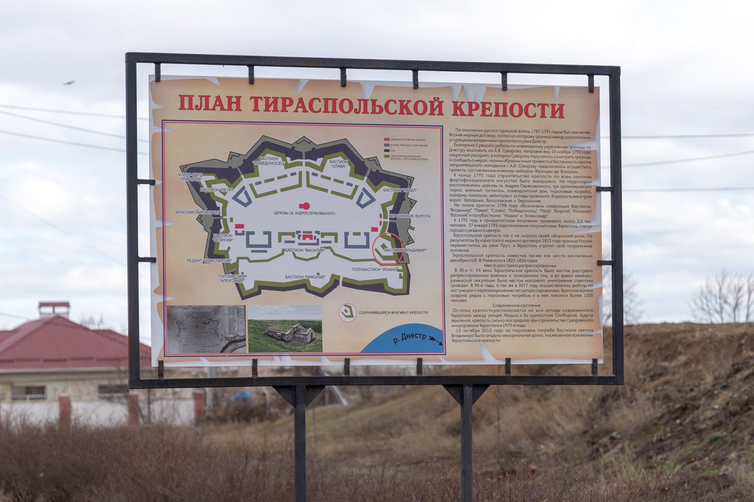 Пресс-служба главы государства напоминает, что здание погреба бастиона «Святого Владимира» Тираспольской (Срединной) крепости, заложенной летом 1793 года по указу императрицы Екатерины II и возведенной при личном участии Александра Суворова по проекту Франца де Волана, включено в реестр памятников истории. Здесь расположен один из филиалов Тираспольского объединенного музея, а также приход во имя новомученников и исповедников.