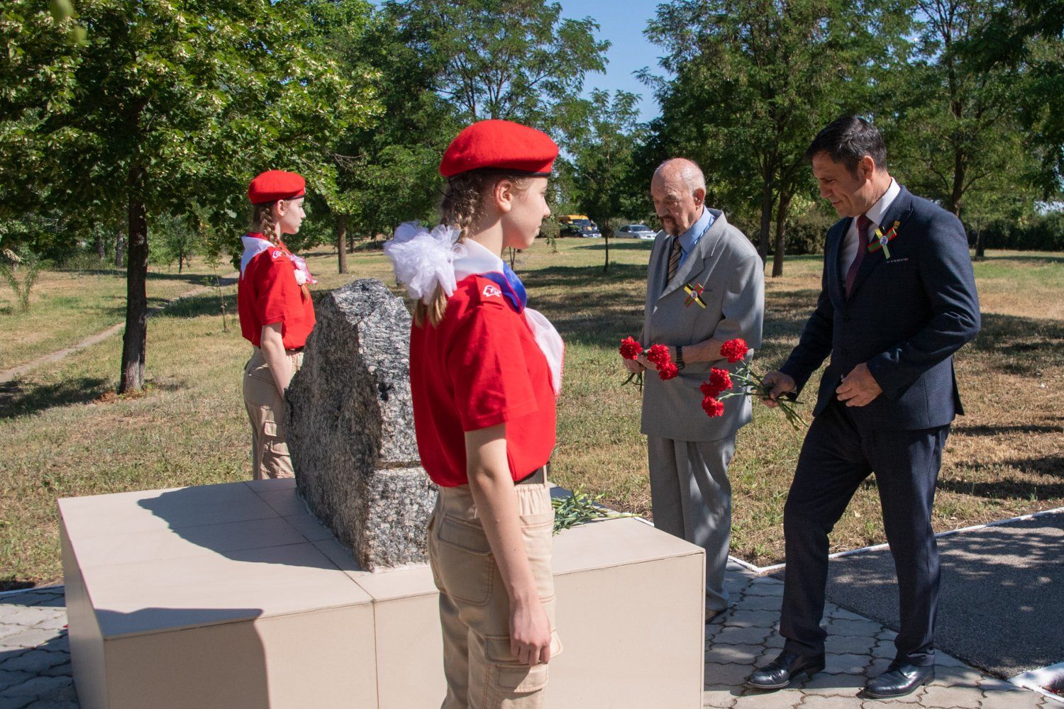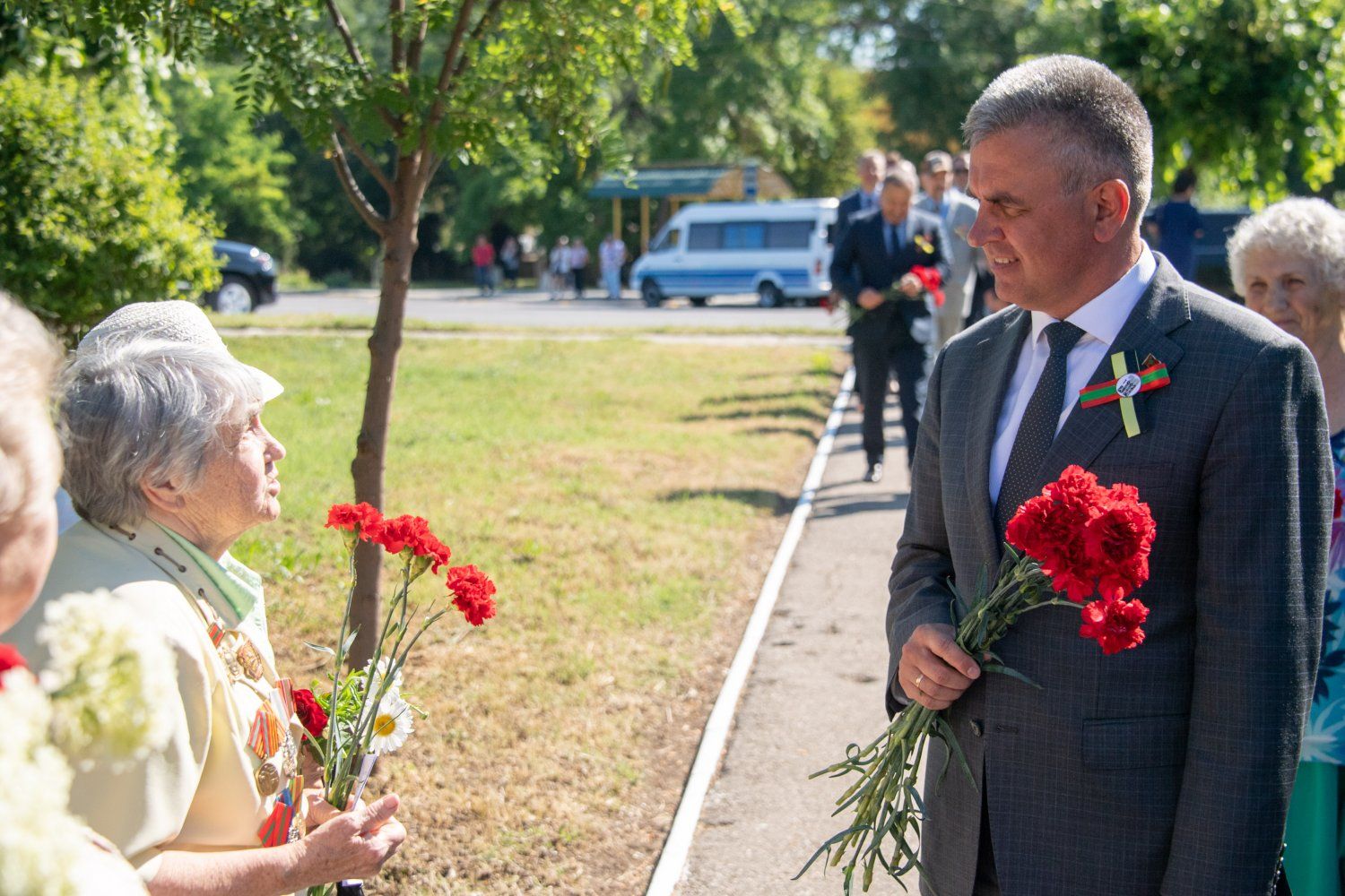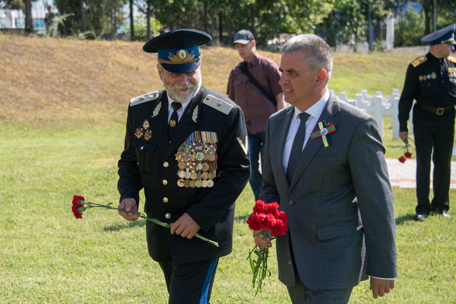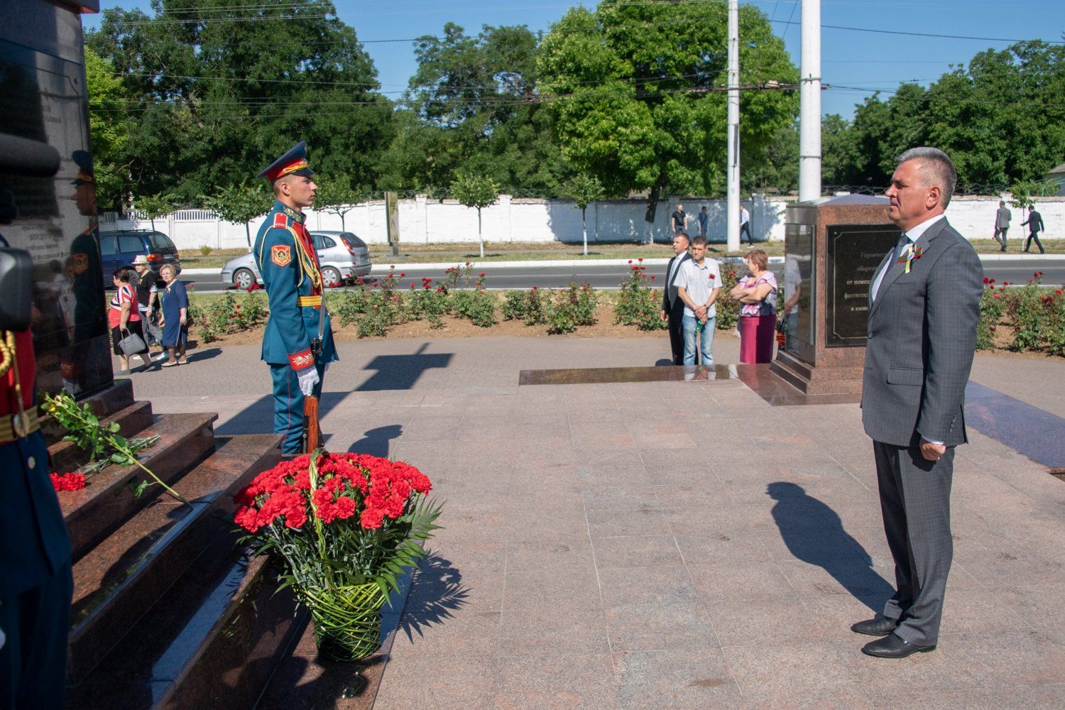 Президент ПМР оставил россыпь гвоздик и у памятника защитникам и мирным жителям, погибшим в 1992 году. Черные гранитные плиты, образующие при пересечении крест, были установлены здесь 19 июня 2010 года.