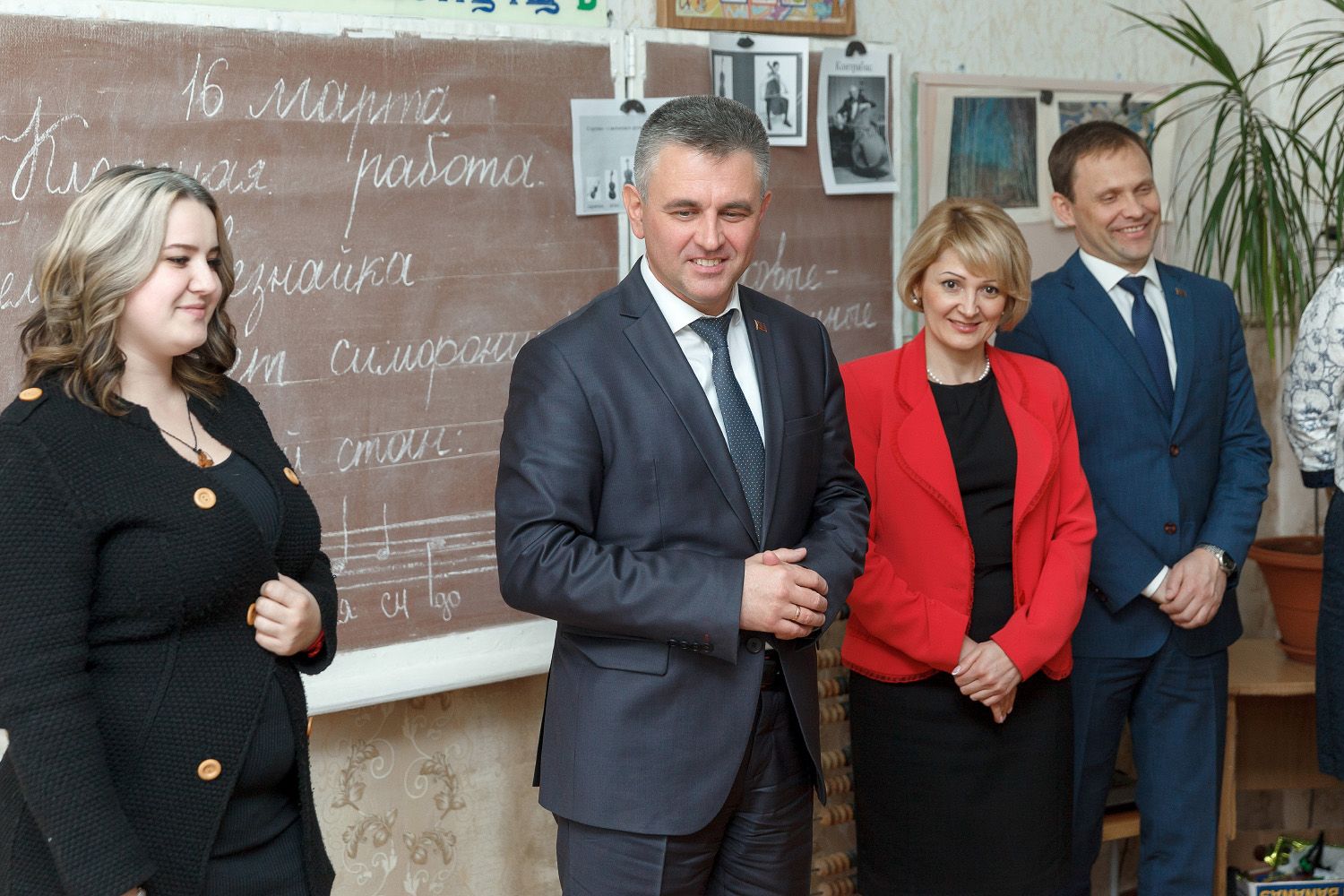 Президент осмотрел классные комнаты, пообщался с первоклашками и выпускниками. Спрашивал о планах на перспективу, нацеливая учеников старших классов планировать будущее без отрыва от родины. Глава государства посетил школьный музей, обратив внимание на значительное количество экспонатов, посвященных Великой Отечественной войне. Президенту рассказали, что патриотизму и сохранению истории в школе уделяют огромное внимание. За каждым классом закреплен ветеран Великой Отечественной войны либо труженик тыла. Ребята ухаживают за Мемориалом Воинской Славы и могилами погибших защитников. О значимости бережного отношения к истории говорится и в записи, оставленной президентом в книге почетных гостей. Вадим Красносельский подчеркнул, что у тех, кто не помнит и не чтит прошлого, нет будущего, и выразил благодарность за похвальное отношение к истории.