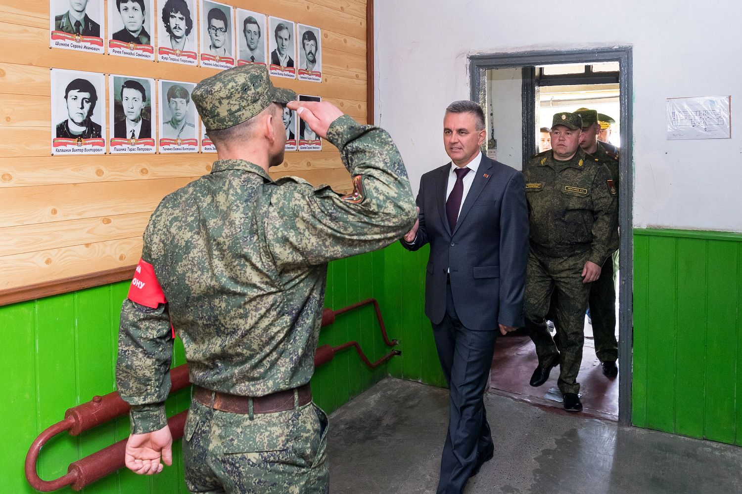 Глава государства побывал в расположении мотострелкового подразделения. Вадим Красносельский уделил внимание пищеблоку и медицинскому корпусу, отметив, что условия быта, качество питания и обмундирования – важные составляющие эффективного прохождения воинской службы.