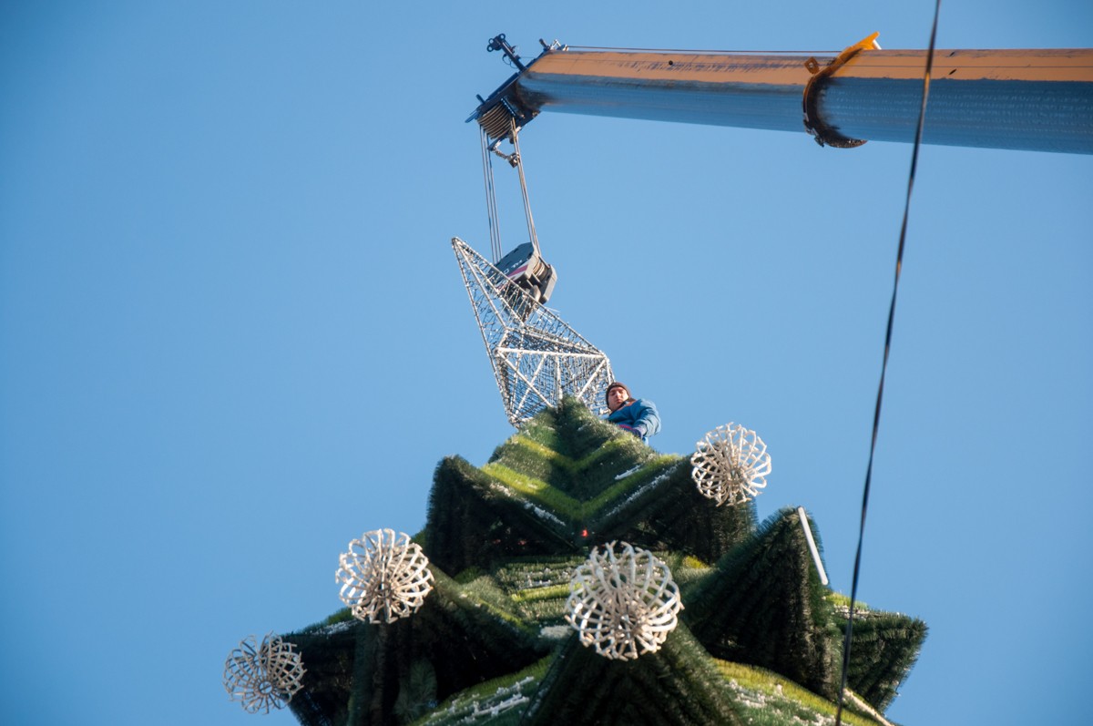 «При монтаже крестовины ёлки, расположенной наверху, а также при её подключении к электричеству было найдено много неисправностей. Поэтому приняли решение изготовить и установить на главной ёлке столицы новую традиционную звезду. Она красного цвета и выполнена в стиле кремлёвской звезды, знакомой многим ещё с детства, с советского периода. Звезда будет светиться и красиво сиять в темноте», - рассказал замглавы госадминистрации по вопросам ЖКХ Николай Обручков.