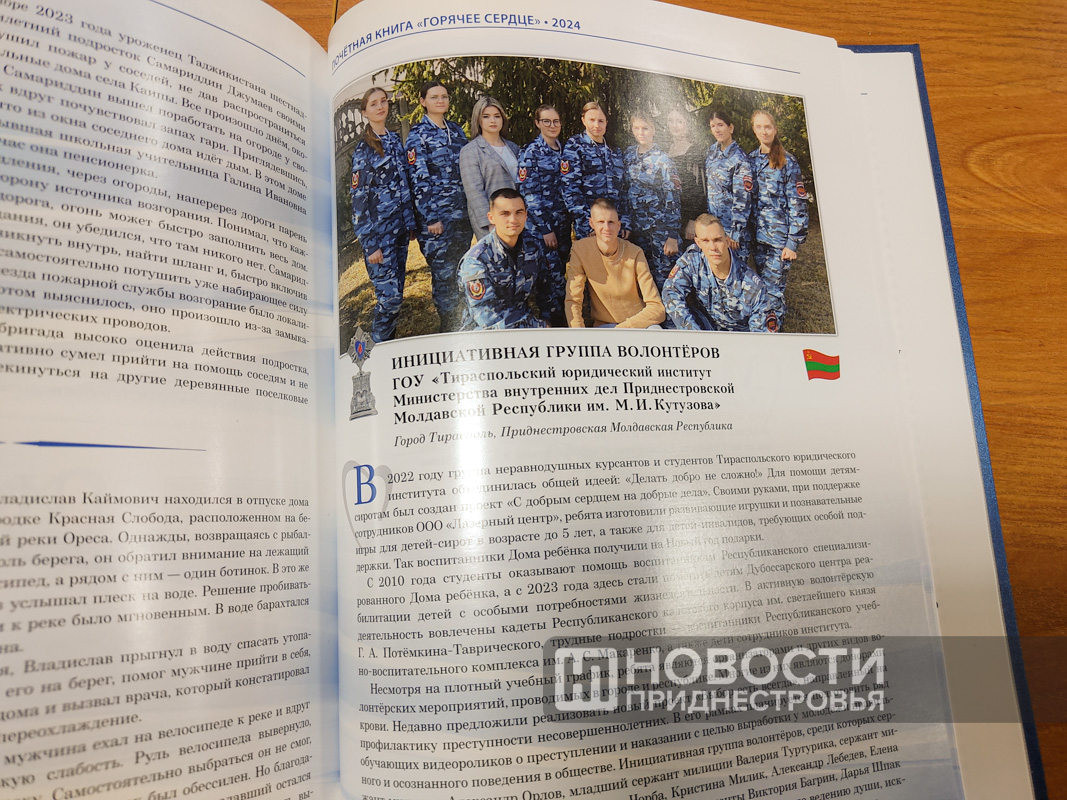 Приднестровская молодежь участвует в инициативе «Горячее сердце» уже несколько лет. В этом году наград удостоили 2 команды волонтеров из Тирасполя - инициативную группу ТЮИ и команду «Творим добро» столичного лицея. Им вручили почетную книгу, статуэтку и диплом «Горячего сердца». Ещё двое добровольцев получили нагрудный знак инициативы. Их имена и истории также вписаны в почетную книгу.