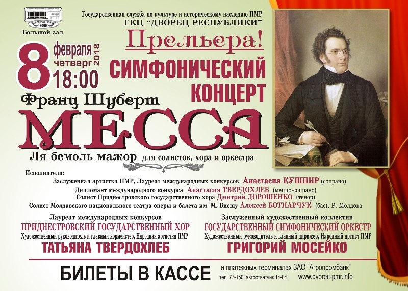 Тирасполь, 3 февраля. /Новости Приднестровья/. 8 февраля в большом зале ГКЦ «Дворец Республики» состоится премьера – большой совместный концерт Государственного симфонического оркестра ПМР и Приднестровского хора. Творческая программа будет посвящена весьма сложному и объёмному произведению австрийского композитора-романтика Франца Шуберта «Торжественная месса».