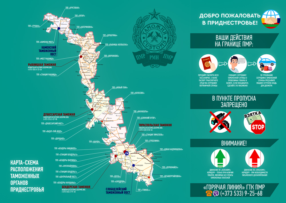 Для туристов дополнительно в памятку включена карта республики с действующими таможенными пунктами пропуска на границе, а для оперативной связи по проблемным вопросам указан телефон «горячей линии» таможенных органов Приднестровья.