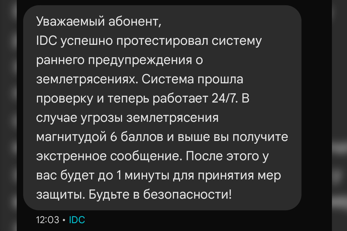 Тирасполь, 13 марта. /Новости Приднестровья/. Компания IDC сообщила об успешном тестировании системы раннего предупреждения о землетрясениях. Напомним, что СМС о землетрясении абоненты «Интерднестркома» получили на свои мобильные телефоны накануне в 11:00.