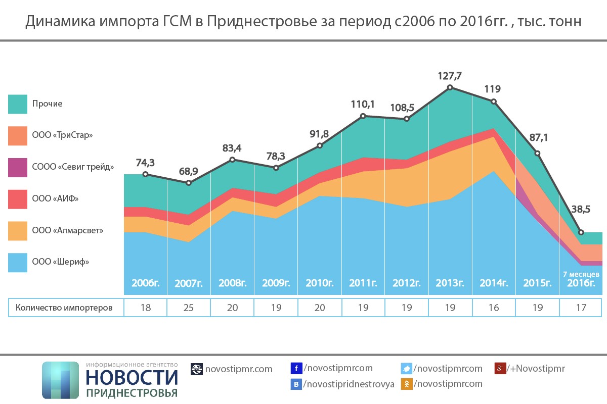 В то же время поставки ГСМ в 2016-м имеют отрицательную, но не критическую динамику: с января по июль 2016 года в ПМР было ввезено топлива на 22% меньше, чем за аналогичный период 2015-го. Одну из главных причин снижения импорта ГСМ в ГТК связывают с обострившейся в июне проблематикой железнодорожного импорта грузов в Приднестровье со стороны Украины.