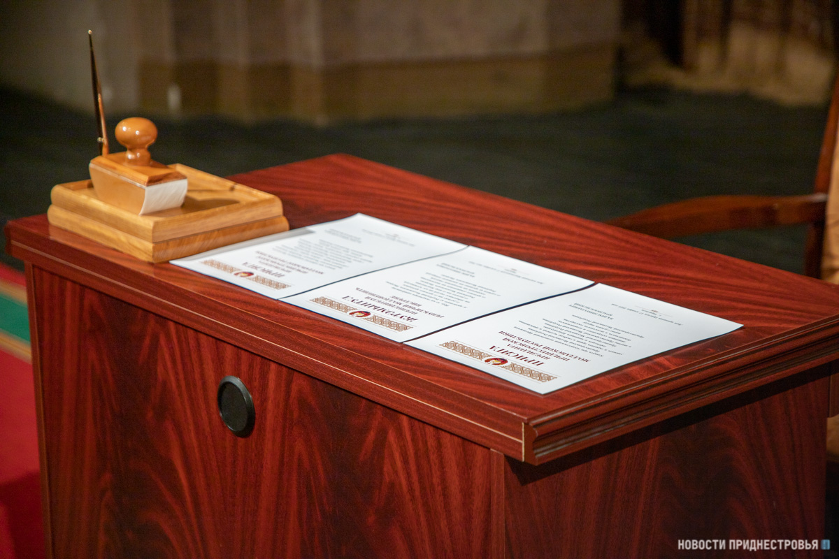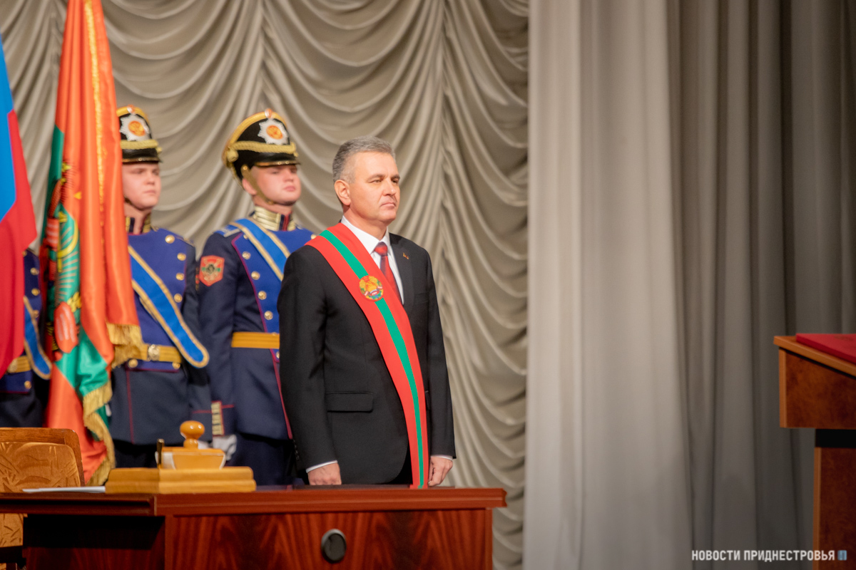 «Клянусь при осуществлении полномочий Президента Приднестровской Молдавской Республики уважать и охранять права и свободы человека и гражданина, соблюдать и защищать Конституцию Приднестровской Молдавской Республики и законы Приднестровской Молдавской Республики, защищать суверенитет и независимость, безопасность и целостность государства, верно служить народу Приднестровской Молдавской Республики», - произносит присягу Президент ПМР.