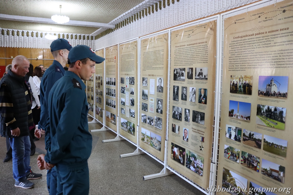 Посетителей ознакомили с документами и фотографиями, в том числе времён Великой Отечественной войны, героев-уроженцев района, фронтовиков, которые восстанавливали народное хозяйство. Отдельный баннер посвящён выдающимся личностям района. Не остались без внимания достижения и значимые события Слободзейского района в наши дни.